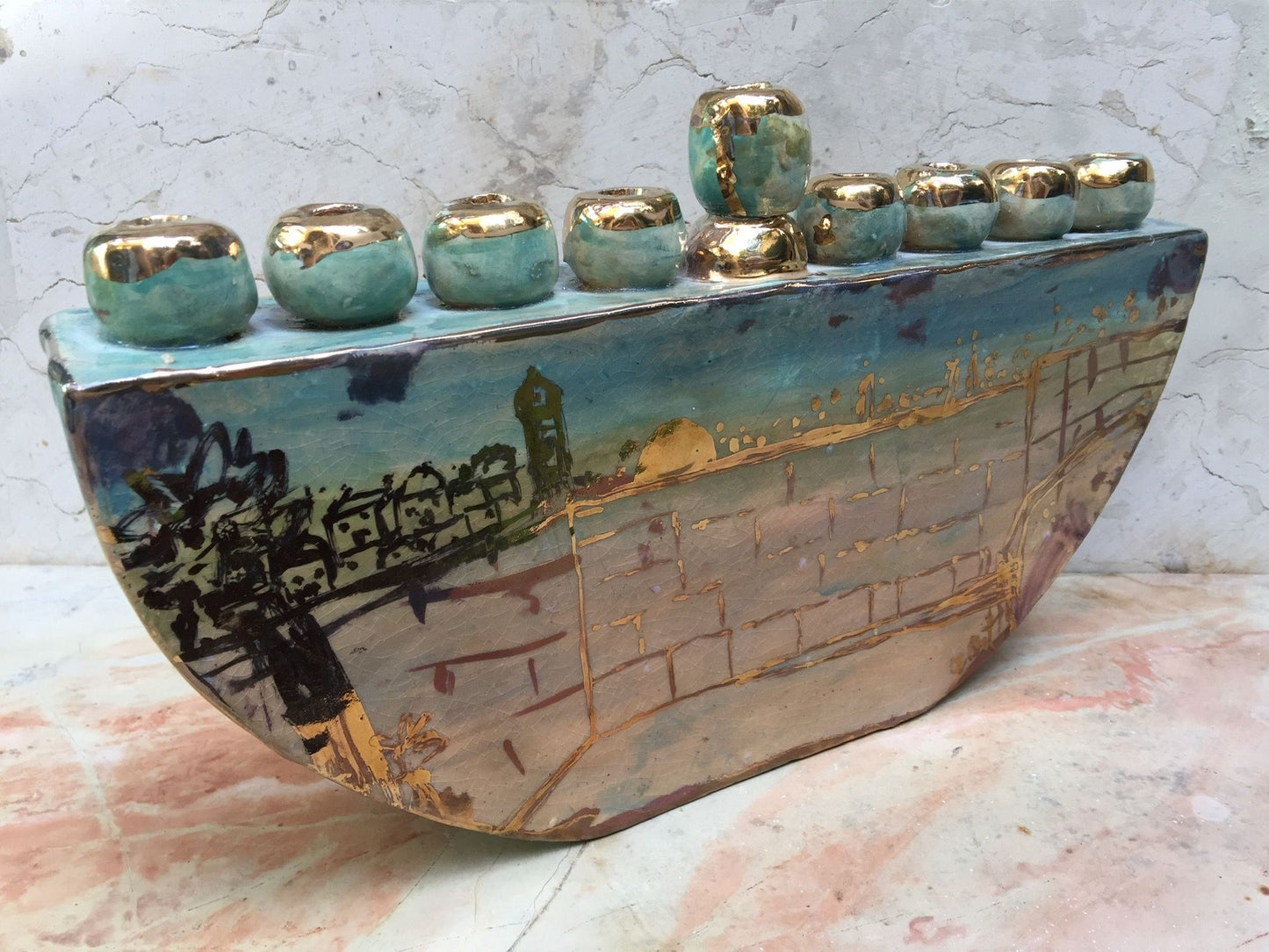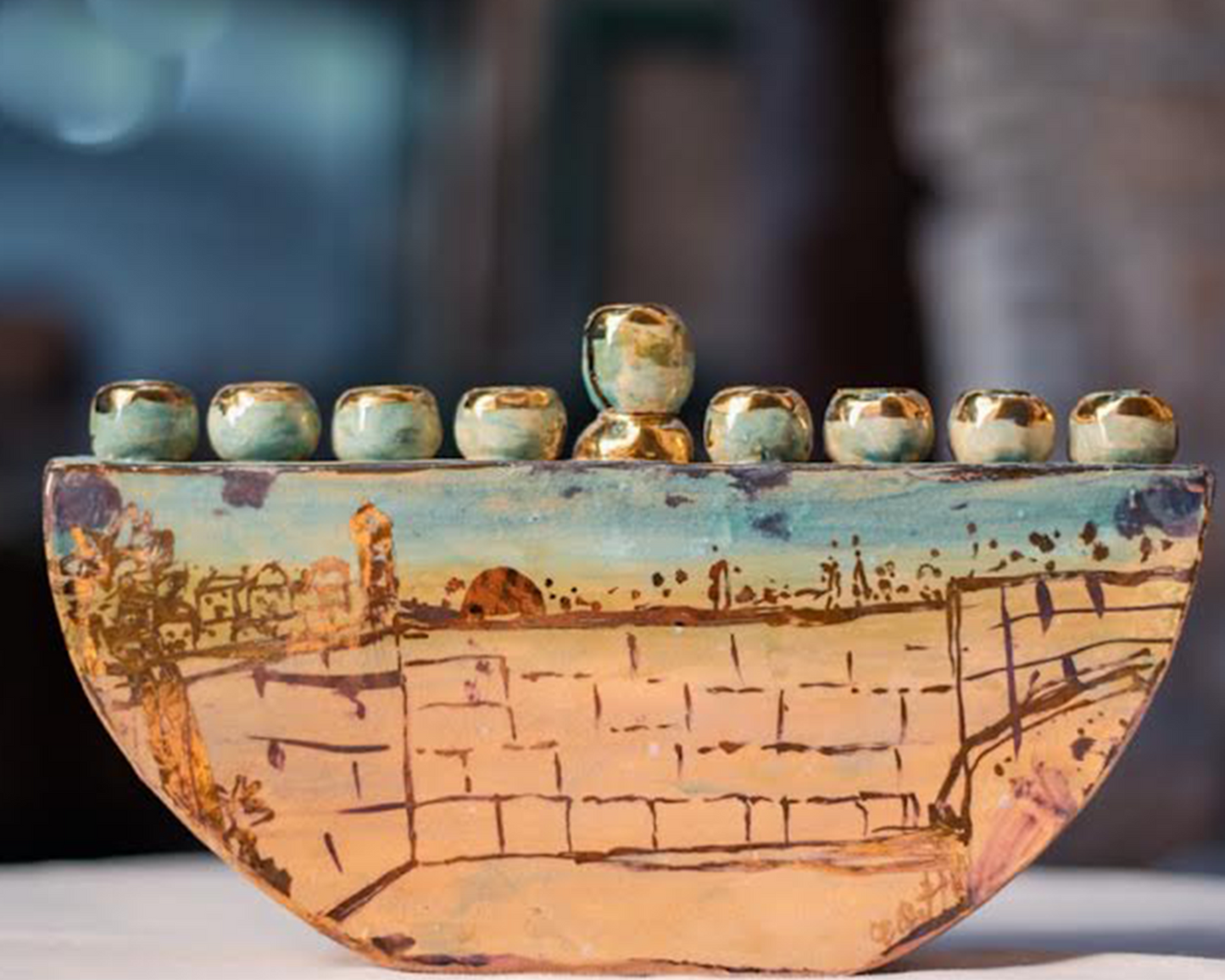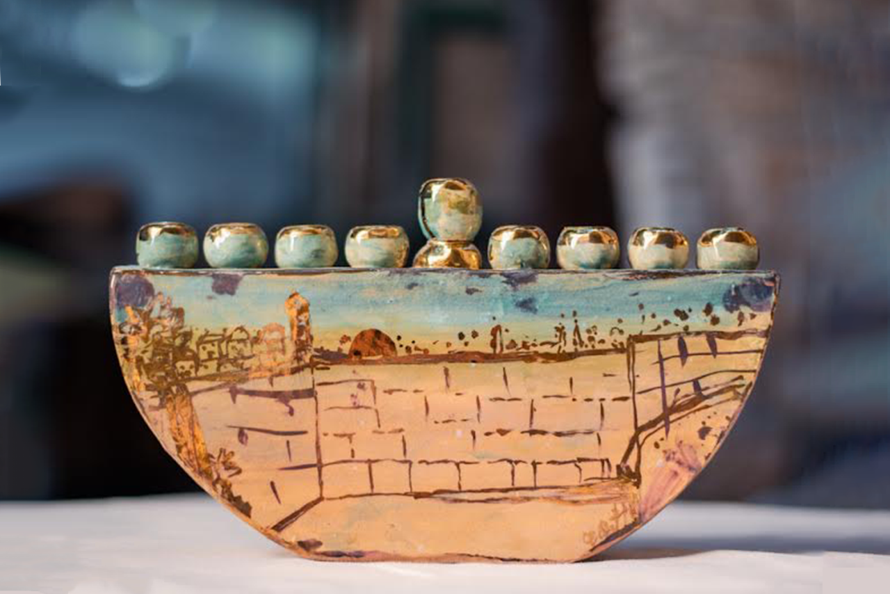 This one-of-a-kind hand-made menorah was inspired by the classic palette of Jerusalem, and and surrounding Hills — soft tones of stone, rose, sand and sky,